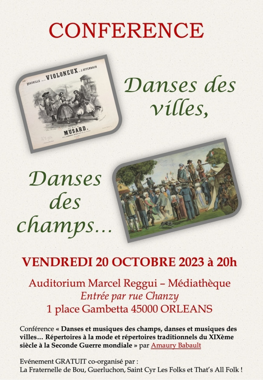 Conférence d'Amaury Babault : « Danses et musiques des champs, danses et musiques des villes… Répertoires à la mode et répertoires traditionnels du XIXème siècle à la Seconde Guerre mondiale » Danses et musiques des champs, danses et musiques des villes… Répertoires à la mode et répertoires traditionnels du XIXème siècle à la Seconde Guerre mondiale Une conférence présentée par Amaury Babault Contrairement à des idées toujours tenaces aujourd’hui, danses et musiques circulent continuellement dans tous les groupes sociaux et dans toute la France, voire plus largement… Le répertoire dansé et joué traditionnel offre quantité d’exemples qui permettent de toucher, d’appréhender cet intense brassage culturel et humain qui court au fil du temps, déjà à la fin du XVIIIème siècle et jusqu’après la Seconde Guerre mondiale et aux années 1970 quand la pratique dansée traditionnelle s’efface toujours plus rapidement. Interroger ces pratiques permet aujourd’hui de mieux comprendre la richesse et les liens des répertoires repris aujourd’hui régulièrement en bals comme en ateliers. Danseur, depuis son enfance, et cornemuseux au sein des groupes d’arts et traditions populaires berrichons la Rabouilleuse d’Issoudun et les Thiaulins de Lignières, Amaury Babault travaille, depuis plus d’une vingtaine d’années, avec Hugues Rivière au travail de synthèse, d’édition et de compilation du répertoire dansé, collecté et filmé berrichon qui a été entrepris plus tôt à l’initiative de Madeleine Surnom. Il a aussi fait la synthèse des collectages de Roger Péarron (analyse du travail de collectage, fiches descriptives et partition des airs et chansons à danser collectées). Conférence vendredi 20 octobre 2023 à 20h Auditorium Marcel Reggui - Médiathèque Entrée rue Chanzy 1 place Gambetta 45000 ORLEANS Co-organisation : la Fraternelle de Bou, Guerluchon, Saint Cyr Les Folks et That's All Folk !
