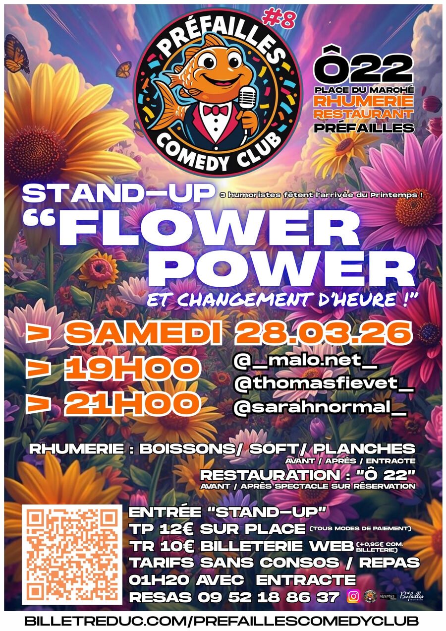 8ème édition du Préfailles Comedy Club à la rhumerie Ô 22. Sessions à 19h et à 21h. Stand-up "flower power" et changement d'heure !
