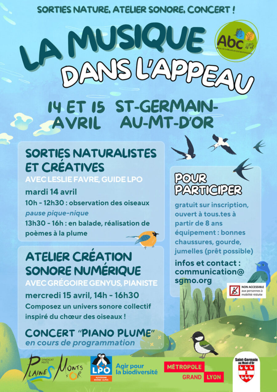 Le SMPMO, la Métropole et la commune de Saint-Germain-au-Mont-d’Or s’associent pour vous proposer 2 jours de découvertes et de création autour des chants d’oiseaux. Avec un projet mis au point par la guide-naturaliste Leslie Favre (LPO) et Grégoire Genuys, pianiste.