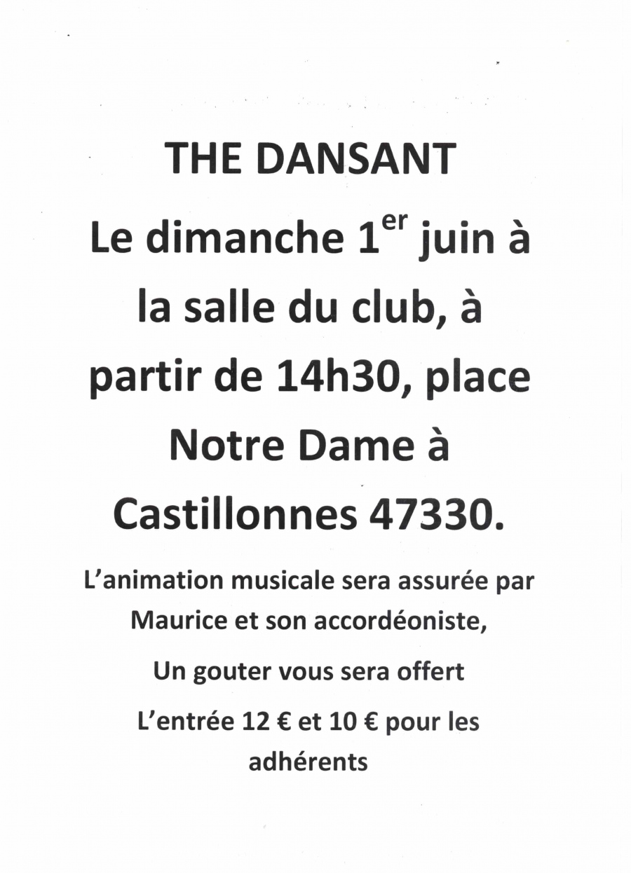 Le Dimanche 1er juin à 14h30 le club de Longuevie à Castillonnes vous invite à un Thé dansant animé par Maurice et son accordéoniste dans la salle du club.