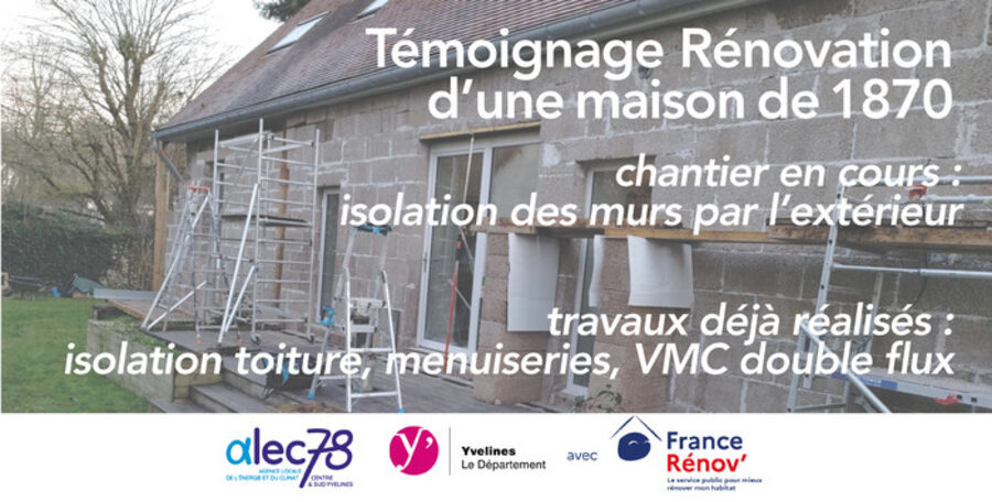 Le propriétaire de cette maison de 1870 nous ouvre les portes de son chantier en cours : isolation des murs par l'extérieur (ITE) en auto-rénovation avec des matériaux biosourcés (blocs de chanvre). Il témoignera également des travaux qu'il a déjà réalisés : isolation de la toiture par l'extérieur (sarking), installation de fenêtres double et triple vitrages, d'une VMC double flux, d'un poêle à bois, d'un ballon thermodynamique, de panneaux solaires thermiques, d'un récupérateur d'eau de pluie... en autorénovation pour une partie et par des professionnels pour l'autre partie. La maison se situe à Mareil-le-Guyon. Le lieu de rendez-vous sera communiqué lors de la validation d'inscription. Cette visite est réservée aux Yvelinois et aux habitants de Bièvres. Le nombre de participants est limité : il est important de vous inscrire uniquement si vous êtes certain de venir.